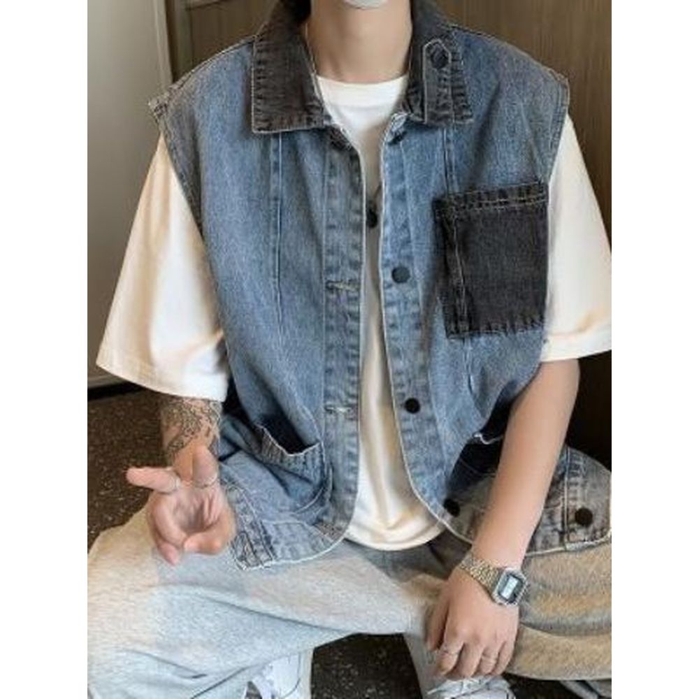 Men's Retro Colorblock Denim Vest Coat Jacket Tops
