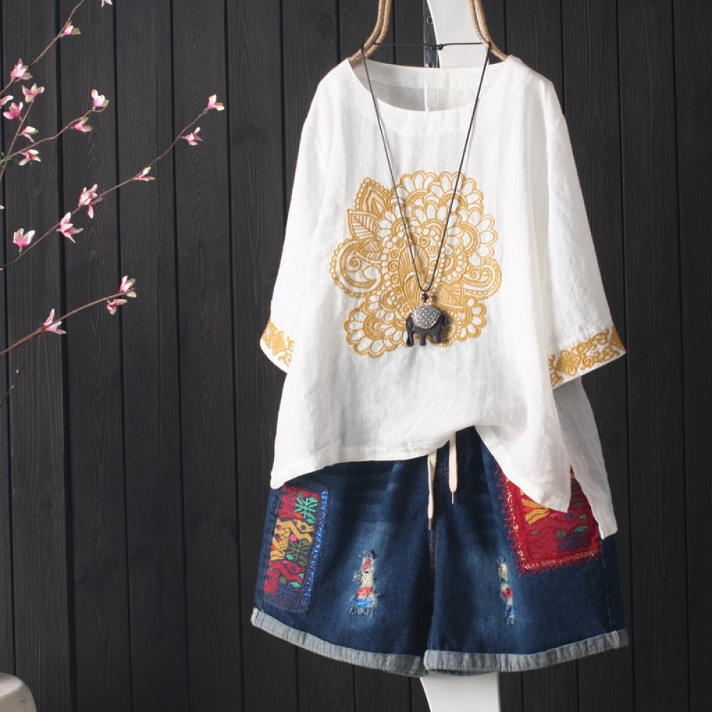 New Literary Retro Golden Embroidery Imitation Cotton Linen Pullover Cotton Short Sleeve T-Shirt Women Loose Top