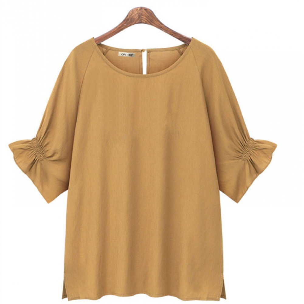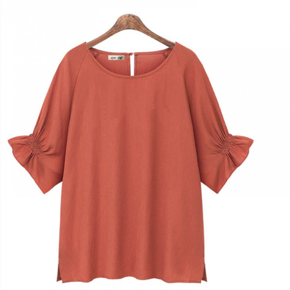 Summer New Style Cotton and Linen Short-Sleeved Shirt Hot Style Bundle Fold Mid-Sleeved T-Shirt Women