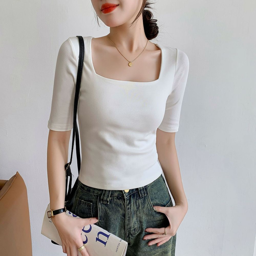 Women's Square Neck Mid Sleeve T-shirt Slim Short Top